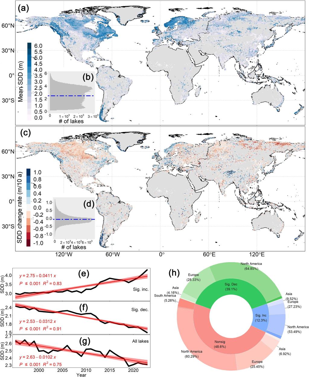中国科学院南京地理与湖泊研究所张运林研究团队,通过构建覆盖1995年至2023年的全球湖泊透明度长期序列数据集,监测范围涵盖面积大于1平方公里的170,799个湖泊,为揭示全球湖泊光环境演变格局与驱动机制提供了新视角与数据支撑。